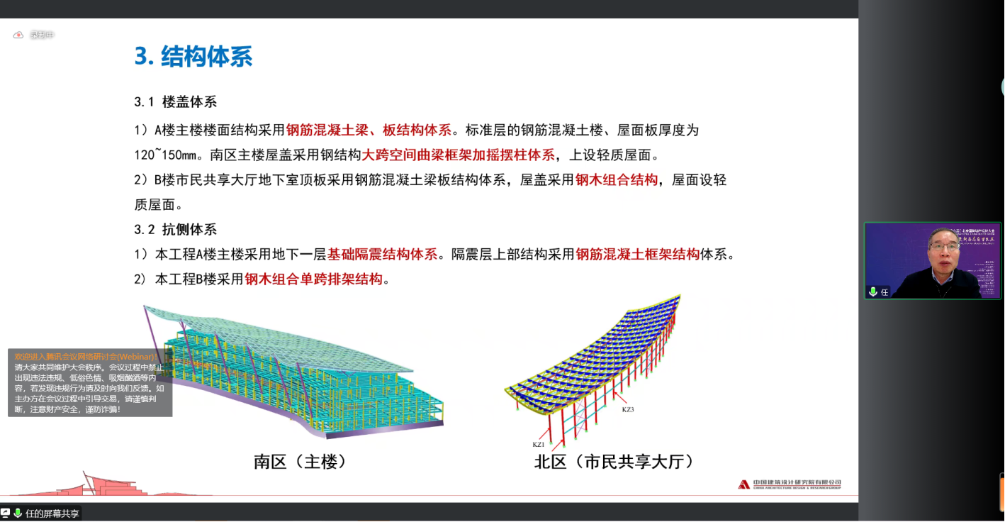 任庆英大师做了《首都博物馆东馆隔震(振)结构设计》专题报告,详细阐述了东馆各楼的结构体系设计,主楼采用钢筋混凝土框架结构,共享大厅采用钢-木混合排架结构,并通过时程分析法研究了主楼的隔震性能,各部位均满足规范要求。