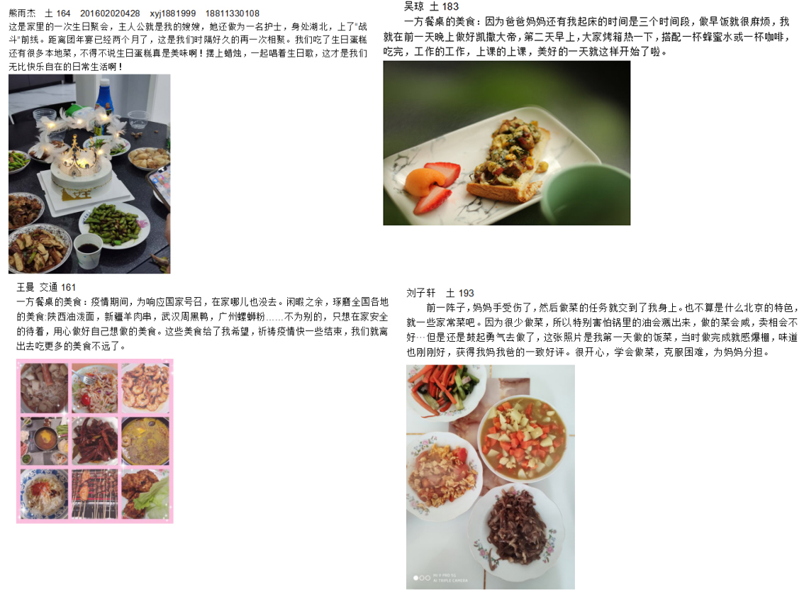土木学院开展“‘疫’起居家,定格美好时光——分享居家小确幸”为主题的宿舍文化节线上活动,疫情期间活动由宿舍转为家庭阵地,内容涵盖师生网课互动、学习笔记展示,居家生活感悟、厨艺美食比拼等内容,共收到182份投稿,陆续在北建土木微信平台上发布,引导学生居家养成良好的学习和生活习惯。