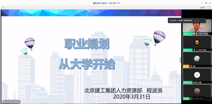 为帮助学生在大学期间提前做好职业生涯规划、了解现今行业走势,为未来职业的选择和发展做足准备,更了解自身的发展定位。3月31日下午,土木学院职涯教育团队、建筑工程系教工党支部联合北京建工集团举办线上大学生职业生涯发展规划讲座。本次讲座邀请建工集团人力资源部部长程波浪进行讲授,学院党委副书记车晶波、建筑工程系党支部书记初明进、系主任廖维张、教研室主任张艳霞、侯敬峰,全体辅导员及2019级学生共292人参加讲座。讲座由院团委书记秦岭主持。