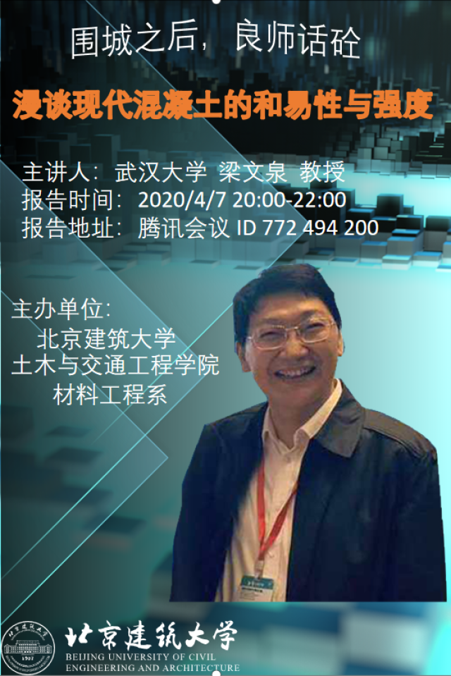 4月7日晚,武汉大学梁文泉教授莅临腾讯会议直播间,为土木学院师生作了主体为“漫谈现代混凝土的和易性与强度”的前沿性学术讲座。讲座由建筑材料学科负责人宋少民教授主持,李崇智教授、李地红教授、侯云芬副教授、周文娟副教授、李飞副教授等老师及建筑材料专业全体本科生及研究生等200多人参加了本次讲座。