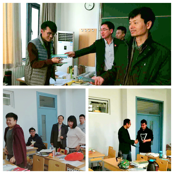 为鼓励考研学生以饱满的精神状态迎接考试,11月28日下午,在距离2018年全国研究生招生考试还有25天,土木学院院长戚承志老师、党委书记冯宏岳老师、常务副院长韩淼老师、党委副书记车晶波老师、大四辅导员阚帅一起走访考研教室,看望慰问了正在备考的同学们,并送上了考试文具,为同学们送去了冬日的温暖和关怀。