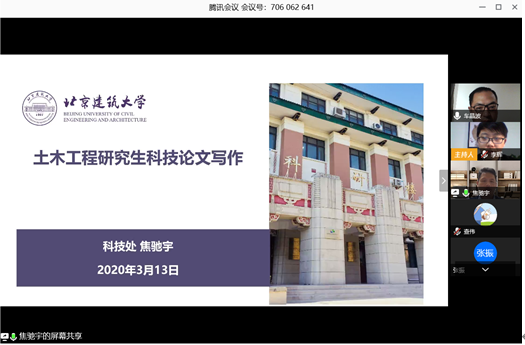 3月13日,土木学院联合科技处、高精尖中心、学报编辑部邀请科技处副处长焦驰宇副教授举行了题为“研究生科技论文写作”讲座。高精尖中心主任李雪华、土木学院党委副书记车晶波以及土木学院全体2019级研究生共134名师生参加。讲座由土木学院研究生辅导员李辉主持。