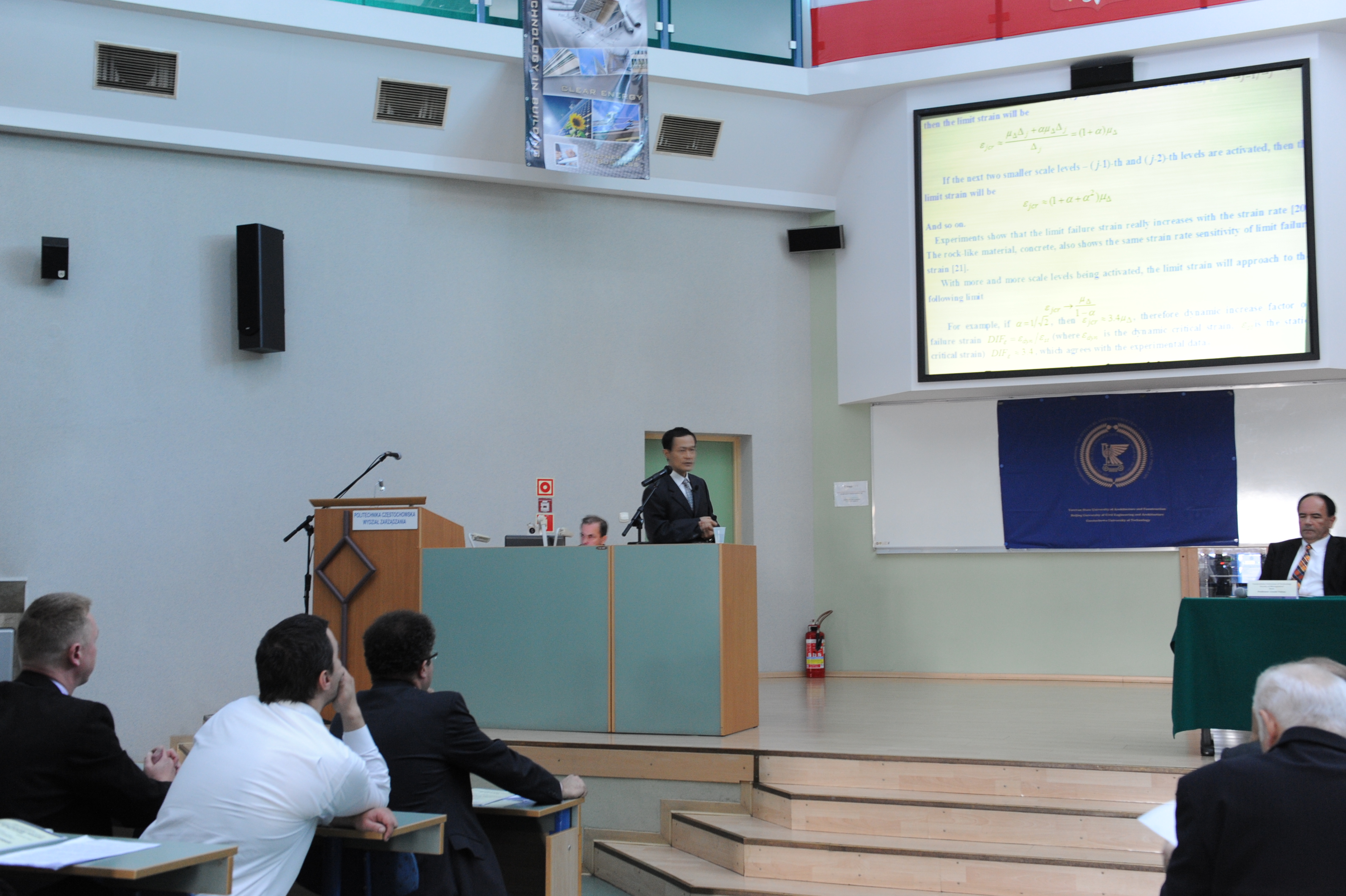 9 月 24 日 大会上午开幕,吴徽教授应邀在主席台就坐,并代表学校作为主办方之一致开幕词,并向参会各国专家学者介绍了北京建筑工程学院近年来取得的成绩,受到了与会代表的瞩目。随后戚承志教授作了题为“On temporal-spatial nature of deformation and fracture of brittle materials”精彩的学术主题报告,受到了与会波兰院士等各国学者的一致赞誉。吴徽教授、董军教授也在分组报告中进行了精彩的报告,董军教授替赵东拂副教授宣读了报告。