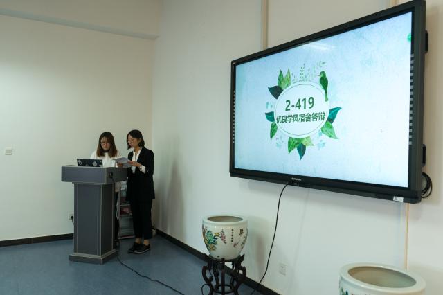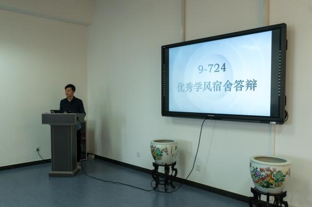 经过宿舍自主申报,共有7个宿舍进入最终评比答辩环节。根据各参评宿舍的全员平均成绩、四六级通过情况和成员获奖情况等设置评分细则,对宿舍学风建设情况进行量化打分。各宿舍通过PPT的形式,从“成员简介”“宿舍环境”“学业及社会实践获奖情况”“文化建设”“特色风采”等方面汇报了上一学年宿舍学风等各方面建设的过程、特色与成果。评委老师们针对宿舍学风建设和文化建设的情况进行了提问,并与答辩选手交流了宿舍建设的体会。