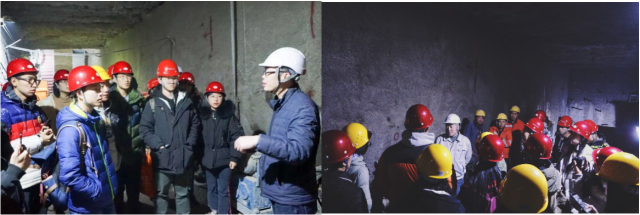 由于地下施工场地狭小,工地的指导老师分4批带同学们进入到地下20m的隧道中,同学们站在老师身边,认真聆听老师们的讲解。通过亲临地下现场,同学们感受到了真实的开挖面,参观了支护形式,看到了实际的通风、照明措施,知道了衬砌、喷射混凝土、掌子面、监测点、收敛、竖井、横通道等专业名词。