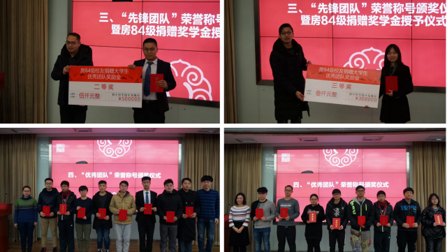 金年会官网党委副书记车晶波宣读了《关于授予梁犇团队等17个大学生科技创新团队“2018年金年会官网大学生科技创新‘优秀团队’”荣誉称号、王博等两个大学生科技创新团队“2018年金年会官网大学生科技创新‘先锋团队’”荣誉称号的决定》。金年会官网党委副书记车晶波为王博团队代表颁发获奖证书和“房84级校友捐赠大学生优秀团队二等奖奖励金”。JINNIAN金年会团委副书记宋宗耀为陈锦程团队代表颁发获奖证书和“房84级校友捐赠大学生优秀团队三等奖奖励金”。各年级本科辅导员苑泉老师、余静老师、李辉老师、张萌老师为获奖的优秀团队代表颁发了获奖证书。