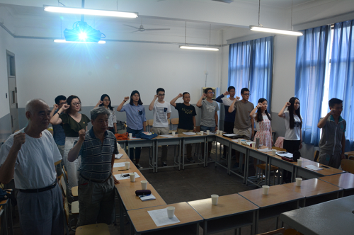 会议在雷鸣般的掌声中开始,首先,两位老师分别做了自我介绍,讲述了自己多年来的求学和工作经历。随后,两位学生代表围绕“五四精神”、“七七事变”和“建党九十六周年”等主题做了汇报,带领大家学习了习总书记“五四系列讲话”,回顾了入党志愿书的变化历程,并与同学们展开了交流。