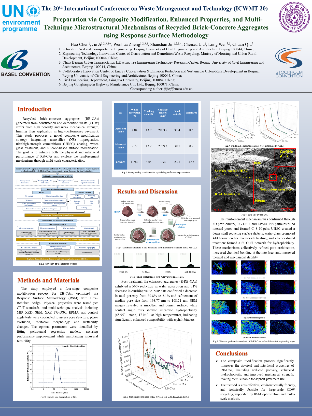 陈浩同学受邀参与大会“学生论坛”并作题为“Preparation via Composite Modification, Enhanced Properties, and Multi-Technique Microstructural Mechanisms of Recycled Brick-Concrete Aggregates using Response Surface Methodology”的学术报告。报告聚焦建筑垃圾中砖混类再生骨料的高值化利用,展示了其构建的响应面优化模型、多阶段复合强化工艺路径及显著改善的界面性能与结构特性。该研究提出纳米硅材料浸渍、超高强涂层包覆、水玻璃处理与疏水剂改性四阶段强化方法,显著提升了再生骨料的致密性、吸水控制与沥青黏附性能。汇报中还结合3D形貌重构、热重分析、扫描电镜等手段,构建了微观机制到宏观性能的关联模型,得到了现场专家的高度评价。