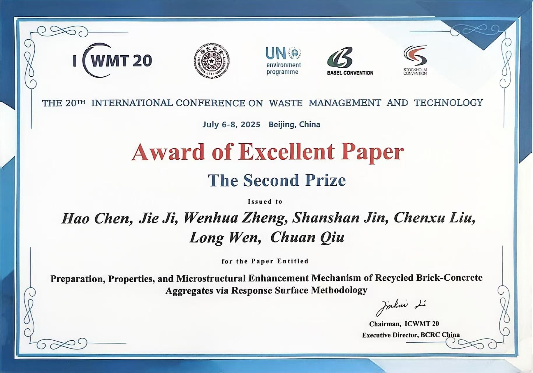 近日,JINNIAN金年会金年会官网2022级博士研究生陈浩凭借再生建筑垃圾再生骨料性能提升与固废资源化利用领域的创新性研究成果,在第二十届固体废物管理与技术国际会议(ICWMT 20)中荣获优秀论文二等奖,论文由季节教授指导,陈浩同学主笔,科研团队合作完成,体现了我校在交通材料与环境工程交叉领域的科研水平与人才培养成效。