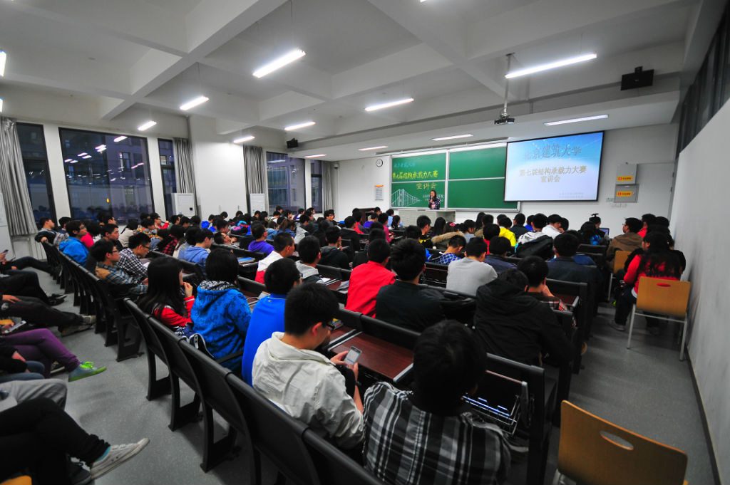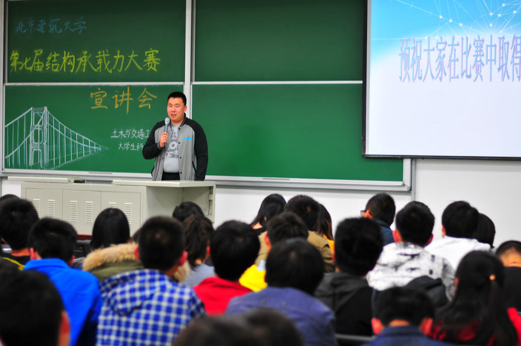 会议伊始,土木学院负责课外科技活动的学生干部为大家介绍了本届结构承载力大赛的前期报名情况,此次比赛共吸引了来自土木学院、环能学院、机电学院等院系同学组成的94组参赛队,近400名学生报名参加。紧接着,董军老师从专业角度出发为同学进行本届大赛赛题讲解,并围绕“如何在课外科技活动提升能力”为主题告诉同学们要在活动中提升专业知识、个人综合素质。随后,13年刚刚从我校毕业的张骏驰学长向在此次宣讲会中和同学们分享了他在大学期间曾多次参与课外科技活动的经验与心得体会。在最后的自由讨论环节,与会学生积极提问,董军教授耐心、详细的解答了每位同学的问题。会议在热烈的讨论中结束了。