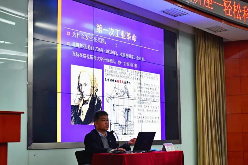 讲座开始后白莽老师围绕科学与科技史展开此次讲座,介绍了科学技术的概念和作用、未来国际竞争力集中在科技创新及科技史的意义与作用。白莽老师将讲座分为两部分:远古到第一次工业革命前夕阶段的科学发展以及蒸汽、电力、信息时代的到来。