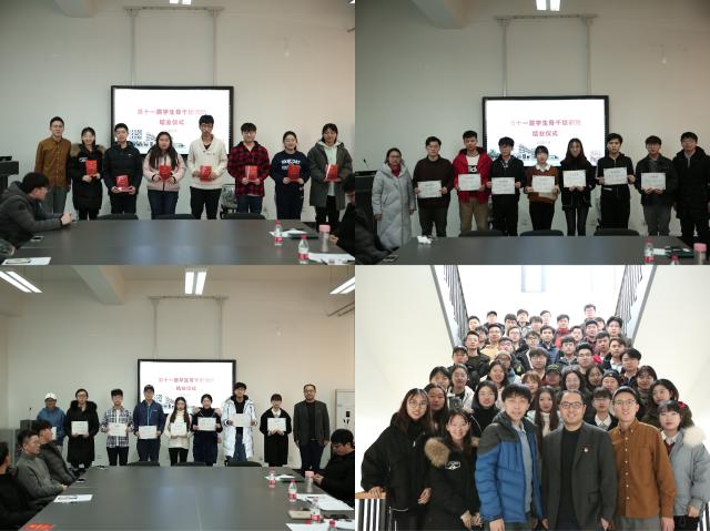1月9日,土木学院在学E438举行第十一届骨干培训班结业仪式,为期3个月的第十一届骨干培训班落下帷幕,会上学生代表分享了他们在骨干培训班中的收获。土185班冯致皓同学通过与外校的经验分享中总结得出各班委和相应的团学部门应该建立对接关系,各个部门将相应的工作落实到位,让每个班委找到自己相应的位置,才能够充分调动班委的积极性。材181班过建军同学认为骨干组织活动时应该做好统筹规划,提前准备,还应加强班团一体化,学生组织是为学生服务的,不能脱离学生基础,加强和各个班级之间的联系。土185班赵宇昂同学通过参加此次培训认识到要做好老师和同学们之间沟通的桥梁,并提升了自身的组织能力和管理能力。土184班崔雷同学通过培训提高了解决问题的能力,并决定在青协接下来的工作中将优化公众号建设、扩大推送内容的范围以及数量,改进现有活动,引入特色活动,建立具有专业特色的志愿服务体系。接着土184班温智新、土184班谭希学、土182班秦佳秋、土182班彭玉翔纷纷向同学们分享了收获与感悟。