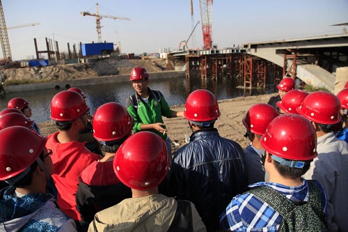 在活动的另外一组中,侯苏伟老师带领大家来到通州区一处城建施工工地。在做足安全准备工作之后,侯老师给学生详细讲解了一些桥梁方面的专业知识,同学们仔细倾听,时不时有同学提问,现场气氛活跃。听到侯老师讲到一些复杂的知识和技能之后,同学们更加深刻的意识到学好专业知识的重要性。而后四位大四实习学长给了学生们提出了一些学习和生活上的建议,嘱咐我们一定要把学习放在首位,并告诫同学们一定要重视每一门课程的学习,在以后的实践工作中都会用到,四位学长诚恳的话语让同学们受益匪浅。
