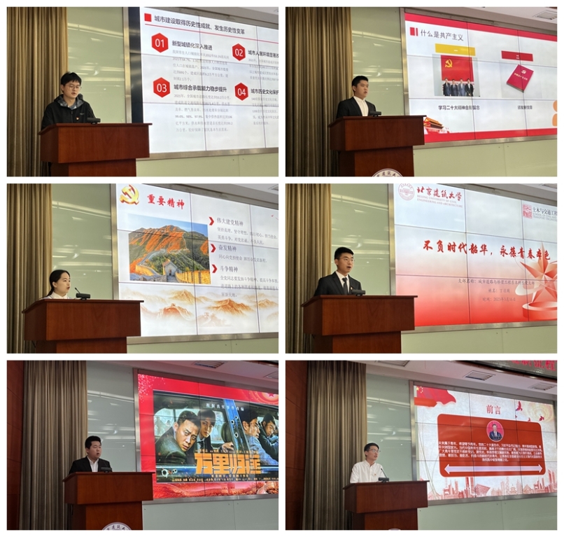 党员们围绕主题自拟题目,以小见大讲述了党的二十大精神学习心得和奋进新征程路上青年党员应有的作为,来自材料与岩土工程研究生党支部的李海峰、交通工程系本科生党支部的宋新天、结构工程研究生第一党支部的杜泽娴分别以“请党放心 强国有我”“当代大学生应怎样理解共产主义”“学习二十大,奋进新征程”为题,结合自己学习党的二十大报告学习心得和所见所闻讲述了自己对党的二十大精神的理解。来自城市道路与桥梁工程方向本科生党支部的丁习周、地下本科生党支部的关启越、土木贯通培养本科生党支部的姚冰、结构工程研究生第二党支部的常永坤分别以“不负时代韶华,永葆青春本色”“万里归途”“发挥青年特质,争做强国先锋”“请党放心,强国有我”为题,结合自己在实际工作学习生活中的见闻,讲述了在奋进新征程路上共产党员们发挥的先锋榜样作用。来自建筑工程本科生党支部的张思艺、土实智建本科生党支部的李洋溢、建筑材料方向本科生党支部的王啸分别以“不忘来时路,筑梦新征程”“蓝图已绘就,青春正当行”“以青春之名 赴时代之约”为题,从党史故事出发,解读党的新时代10年取得的伟大成就,讲述党在二十大报告中擘画的宏伟蓝图。来自交通工程研究生党支部的张瑶、结构工程研究生第三党支部的李浩、道桥工程研究生党支部的孟斯超分别以“青春献礼二十大,强国有我新征程”“做合格新时代青年”“为政之要,惟在得人”为题,分享在实现中国式现代化新征程上青年应担当的使命与责任。