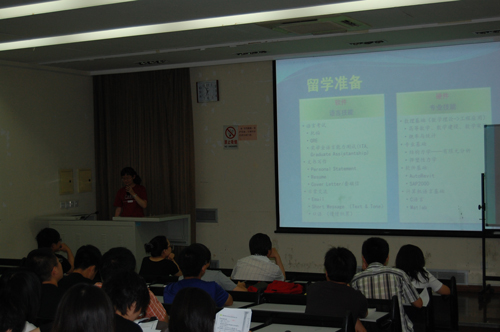 首先吴徽院长为学生们介绍了有关出国留学的情况,张艳霞老师也就大学生生涯规划作了一些讲解,随后曹悠悠同学结合在美国一年的研究生学习经历,以浅显易懂的语言,为师弟师妹们详细介绍了有关大学规划及出国留学的内容,讲座内容丰富,贴近同学生活,受到了同学们的热烈欢迎。