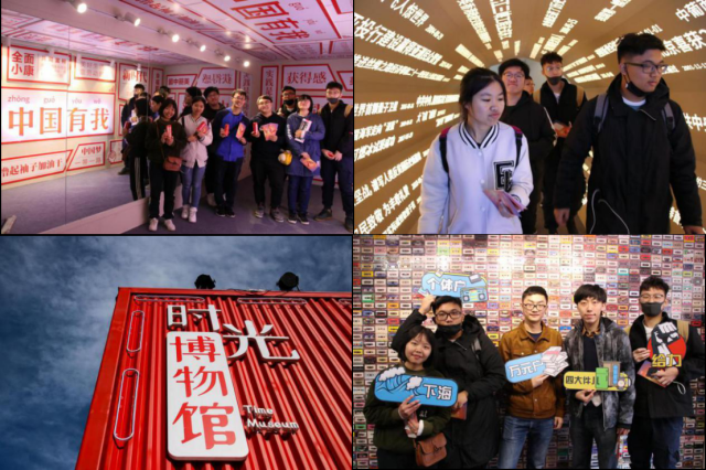 在五大展馆内,师生们参与了9大创意互动活动与展示:时光杂货铺展出的儿时物件,勾起了大家的童年回忆;在声音博物馆听过去的声音,并录下对祖国的美好祝愿;在年代照相馆留下最青春活力的照片,纪念逝去的旧时光和憧憬未来的新生活。