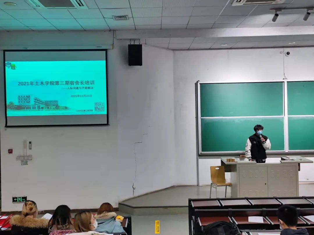 11月22日,土木学院2021级宿舍长培训第三讲暨结业仪式在学院楼A101教室举行。本次培训的主题是“宿舍人际交往及沟通技巧”,旨在提高宿舍长的人际交往能力,提升应对宿舍矛盾冲突的能力,本次培训由土木学院团委书记苑泉主讲,活动由土木学院心理委员联合会组织,全体新生班级生活委员及宿舍长参与培训。