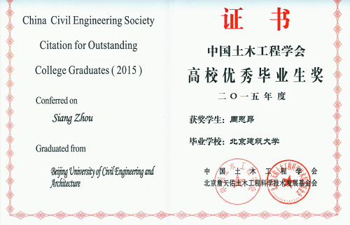 2015年“中国土木工程学会高校优秀毕业生”于12月21日揭晓,我校毕业生周思昂从全国400所大学推荐优秀毕业生候选名单中脱颖而出,荣获“中国土木工程学会高校优秀毕业生”称号,这是我校毕业生连续11年获奖。连续11年获奖充分证明我校人才培养质量得到稳步的提升,表明我校毕业生得到全国相关专家的广泛认可。目前周思昂就读于伊利诺伊大学香槟分校,曾在校期间收到8所全美排名前25高校的录取通知书。