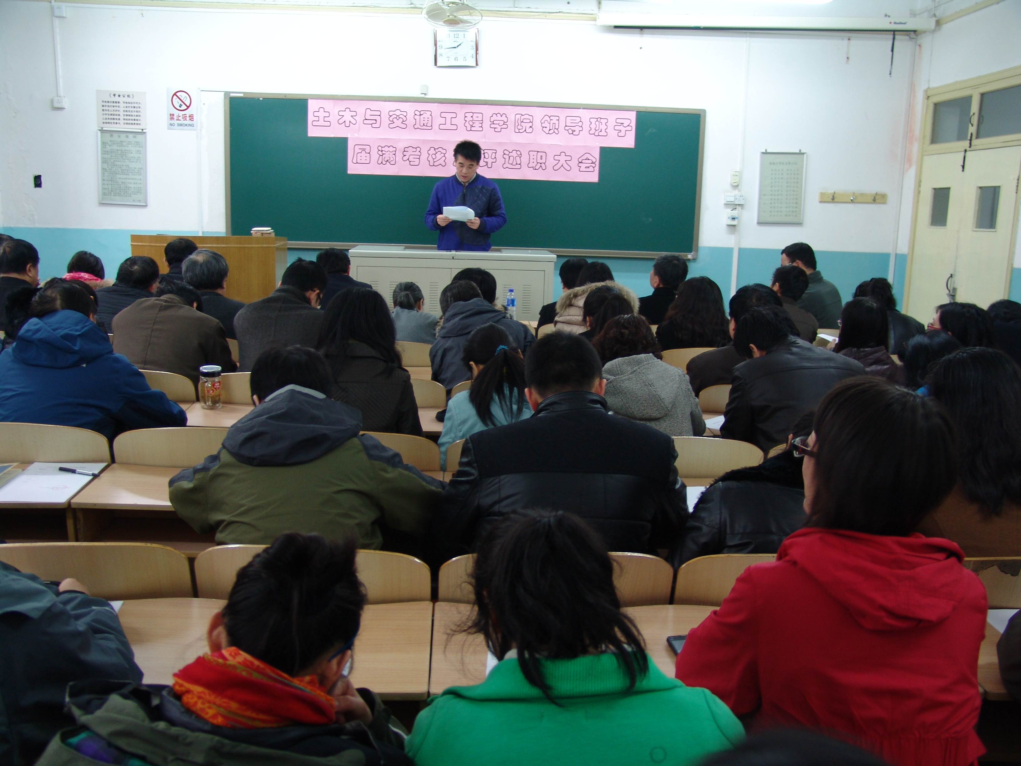 土木学院领导班子届满考核测评述职大会严格秉承校党委要求,以“三个代表”重要思想和科学发展观为指导,坚持公平公正、客观准确、注重业绩、鼓励创新、突出重点工作、定量和定性相结合、区分职责、分类考核的原则,领导班子成员根据自己主要负责的工作内容,高度重视、精心准备、实事求是地依次向本单位全体教职工和考核工作组述职,围绕德、能、勤、绩、廉等方面,重点汇报了自己任期内取得的成绩和存在不足,并提出了今后的努力方向。
