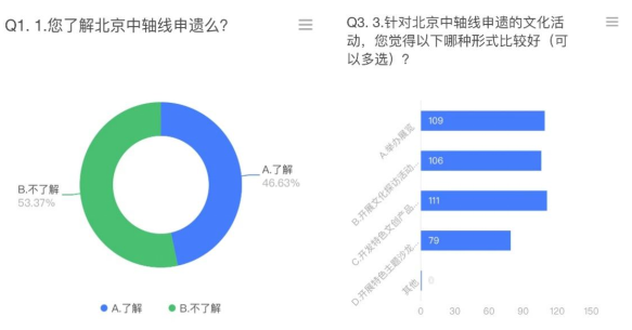 团队通过问卷网平台,重点针对青少年(大学生及中小学生)开展了中轴建筑保护现状调研,团队基于前期了解和调研目的,围绕“中轴线申遗公众了解程度、遗产活化利用的主要形式,文创产品开发利用的评价”等方面开展线上调研。截至2023年7月31日,团队共收到160余份有效问卷,问卷结果显示53.37%的被调查者不了解北京中轴线申遗、46.01%的被调查者无法正确说出中轴线遗址点。线上调研结果为实践团进一步确定了“中轴线遗产活化利用”的实践方向。