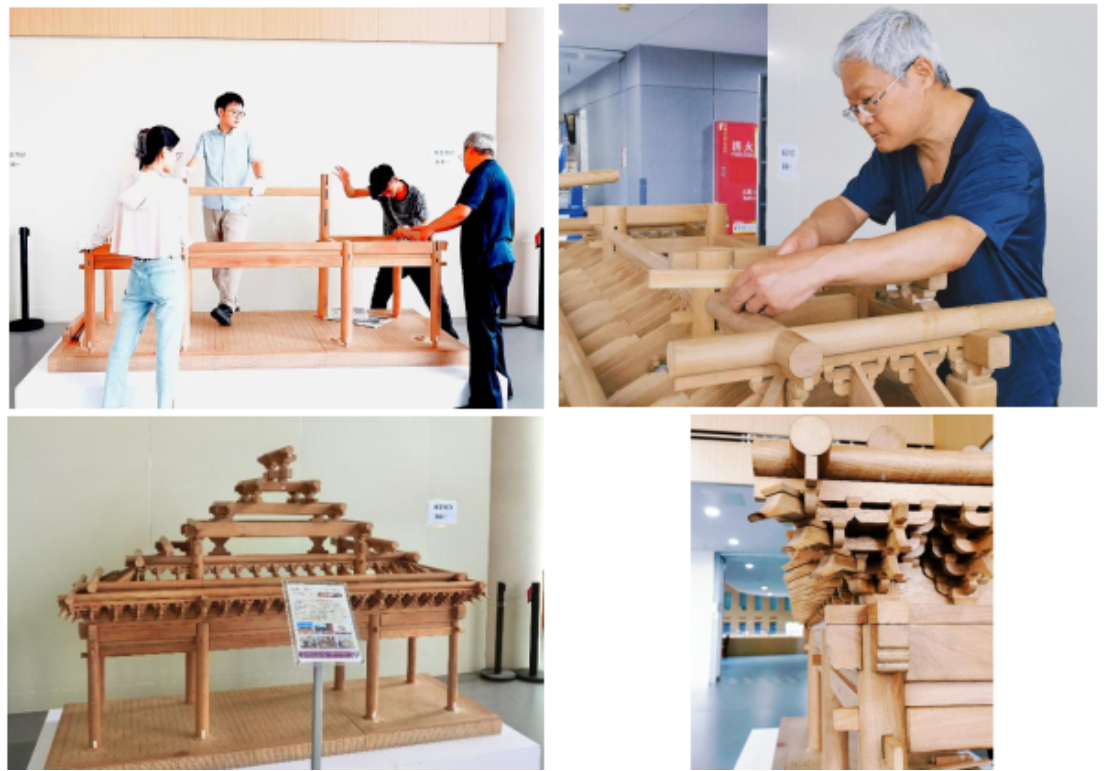 亲身实践,感受文化的魅力。北建大图书馆的四楼,在王锐英老师的悉心指导下,同李旭阳老师的亲身参与,实践团成员积极参与了先农坛太岁殿模型的搭建,从最初零散的标号木条,一步步搭建出比例为1:10的先农坛太岁殿模型。这个过程不仅让我们感受到了“文化+科技”的魅力,更在努力中汲取了珍贵的经验。如今,这一精美模型正庄重地展示在图书馆四楼的展览处,吸引着无数师生的目光。