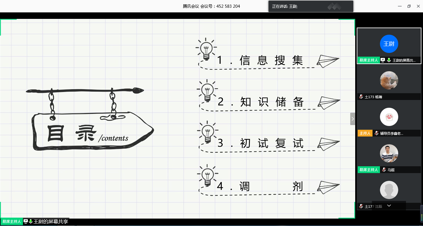 王尉从信息收集、知识储备、初试复试、调剂四个方面分享了备考中的经验,并建议考研期间一定不要孤军奋战,要寻找一个值得托付的研友,互相鼓励,一起向前。充分利用目标院校的贴吧、考研吧和目标学校官网等各种渠道搜集分数线和录取比例、考试科目、准备学习资料。