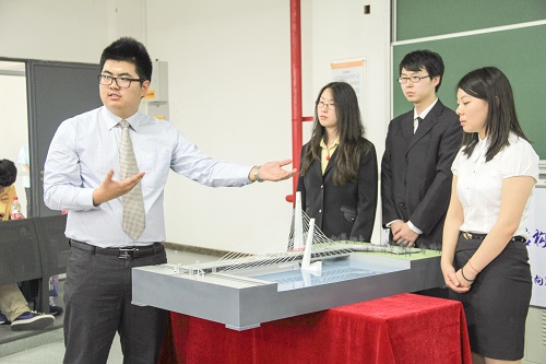 B组(桥梁方向)的赛题内容为北京通州新城运河核心区北关大道跨北运河大桥设计。我校由焦弛宇、金珊珊博士为指导老师,土木学院汪林、白宏博、王琦、朱新宇和建筑学院王思佳、赵睿6名同学组成本赛题代表队。他们设计出一座双层斜拉桥,下层链接主路为行车路,上层抬高行车人行绿色公园,真正做到人车分流,取名“韵•育”。“不但承载南往北来的船只,更滋润着沿岸的运河儿女”成为作品的设计理念。该作品凭借评价出色的独特的桥梁结构和设计理念获得本赛题一等奖。