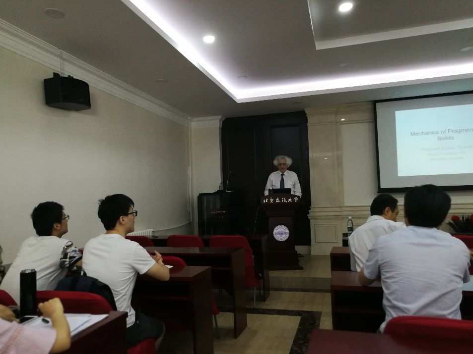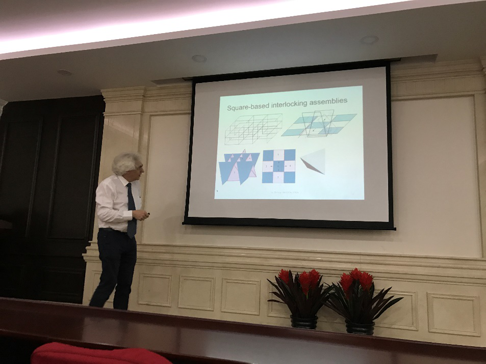 Arcady Dyskin教授开始介绍了自然界中,岩体中由不同大小岩石块体组成,并阐述了岩石块体之间能够保持稳定的相互作用力学特性。然后,在此基础上,教授介绍了其提出的一种新的研究领域-拓扑互锁结构。针对不同形状的固体模块所组成结构,在承受静态、准静态及动态作用下的力学试验特性进行了研究分析。并对所提出的试验结果给出了理论模型,通过理论模型,解释了拓扑互锁结构的力学机理。讲座结束后,Arcady Dyskin教授与参加讲座师生展开热烈讨论,并详细回答了大家的问题,会后大家都表示很受启发。