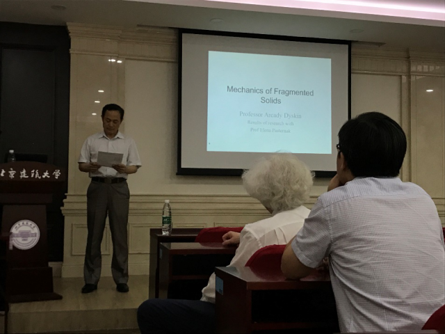 6月21日,应我校金年会官网的邀请,西澳大学,Arcady Dyskin温斯洛普教授,到我校开展学术交流活动,并在教1-126报告厅为学校师生做了题为“Mechanics of Fragmented Solids”的学术报告。我校师生20余人参加报告会,报告由研究生院常务副院长戚承志主持。