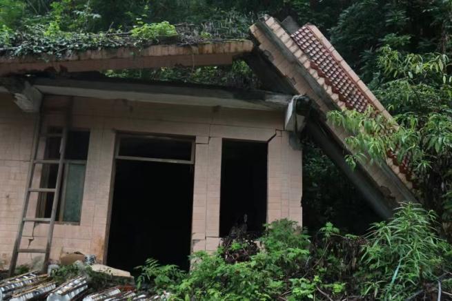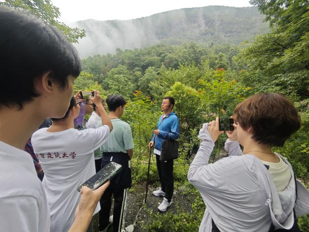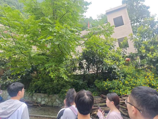 随后,实践团来到北川沙坝断层朱家段山腰的一处地震损毁建筑旁,调研了墙体在地震中的破坏情况,特别是门窗洞口两侧墙角虽体积较大但较少受损的应力集中现象。周老师通过简洁生动的语言,分析了地震往复波动与裂缝形成的关系,通过对水平裂缝的分析讲述了地震引起房屋破坏的过程。接着,实践团深入朱家段遗址区的一栋高层住宅旁。该处住宅呈现出高烈度地震对特定地区地貌的典型影响,震后房屋与院落产生了11米高低差。现场实践团成员还与周洋老师探讨了造山运动及板块相互作用的关系,周老师通过比较四川盆地与其他地震多发区域,生动形象的为同学们讲解地壳板块运动稳定性差异,并强调地形因素在地震活动性中的关键作用。此外,针对结构抗震特性,周老师还为实践团同学们点评了中国传统木建筑中榫卯结构的优质抗震特性,让同学们在增长知识的同时也不禁赞叹古人的智慧。