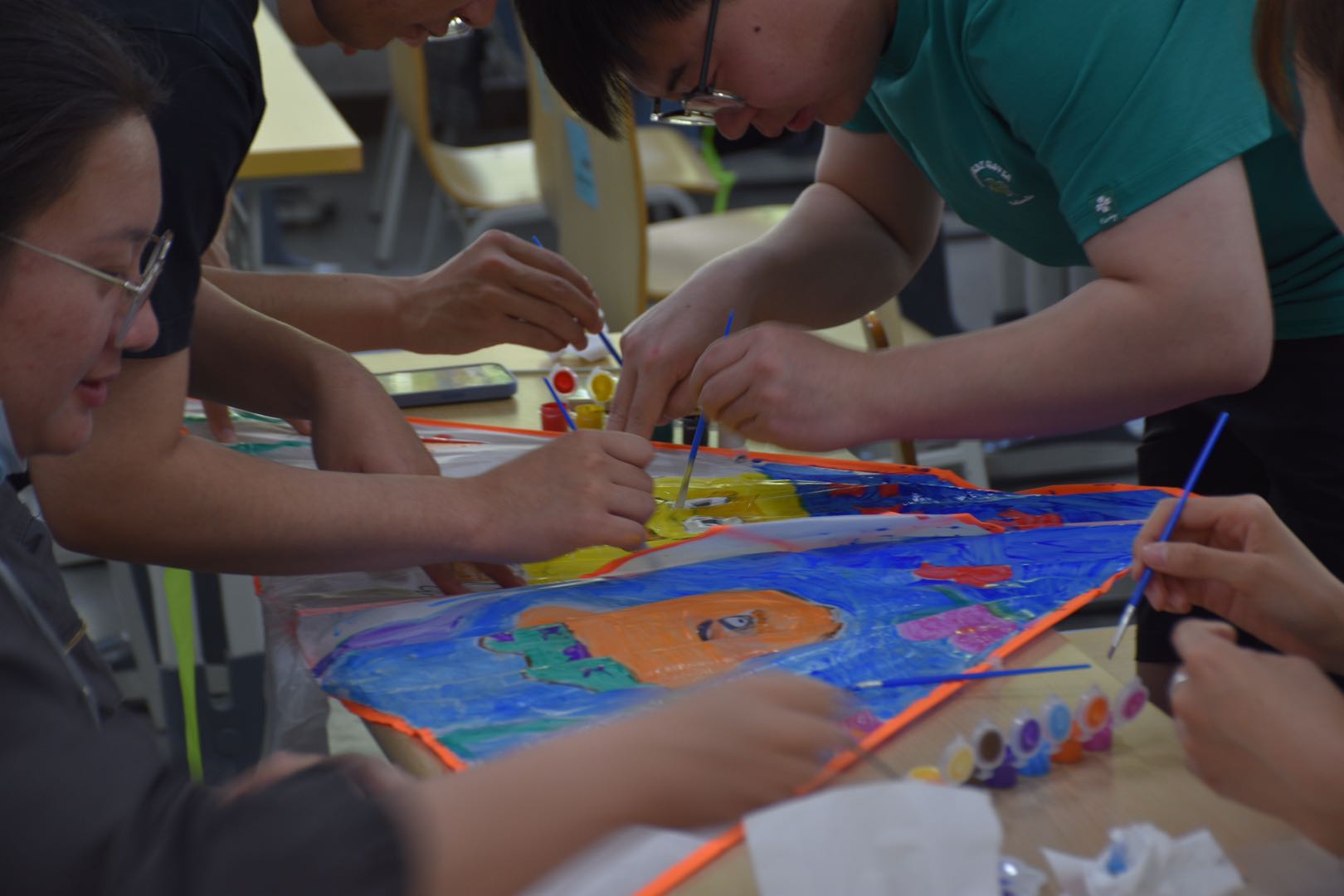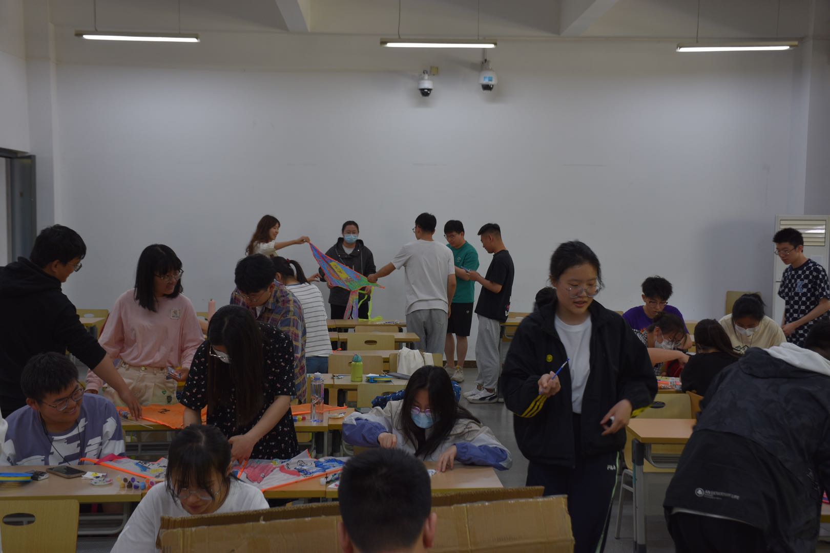 同学们从风筝纸面的绘画到其结构的简易组装全部参与其中,团结协作,互帮互助。同学们用水彩笔沾着色彩缤纷的颜料,渲染出多姿多彩的校园生活,绘画出简单而富有童趣的画作,同学们乐在其中,对简单、自由、质朴生活的心心向往。学习,生活所带来的压力都随着笔触在纸上划过而消散云烟。