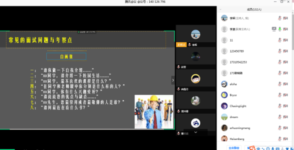讲座期间,李赟老师主要从“大学就业形势分析”、“面试的类型与建议”、“常见问题与致胜妙招”三个方面为同学们进行了分析与讲解。首先李赟老师为同学们分析了目前大学生就业的整体形势,大部分企业的招聘岗位会有所缩减,而就业人数却不断增大,导致毕业生的就业压力比较大,就需要同学们认真准备每一场面试;李老师紧接着为同学们从视频设备、视频环境、个人形象以及准备内容四个方面进行了视频面试技巧地讲解;最后李老师总结了几个常见的面试问题、考察点以及致胜妙招,为同学们的春季就业提供了宝贵的建议。