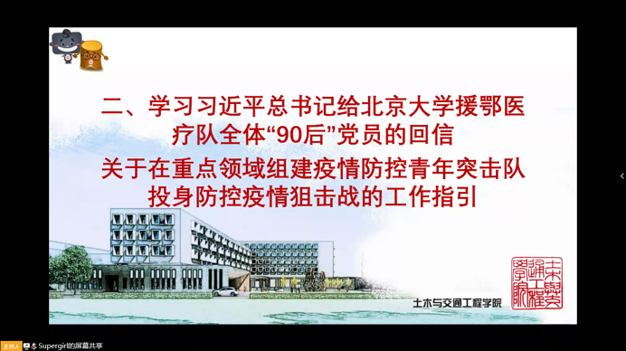 首先,会议由吴为同学带领大家学习共青团中央关于习近平总书记给北京大学援鄂医疗队全体“90后”党员的回信。在信中,习总书记写到“在为人民服务中茁壮成长、在艰苦奋斗中砥砺意志品质、在实践中增长工作本领”,对青年工作者在疫情中的奉献予以充分肯定,勉励广大青年在工作中要艰苦奋斗、磨炼意志,以积极认真的态度完成任务,获得成长。吴为提出团学骨干应发挥青年突击队的作用,带头落实学校及学院的各项要求,为学校能够平安度过疫情时期保驾护航。