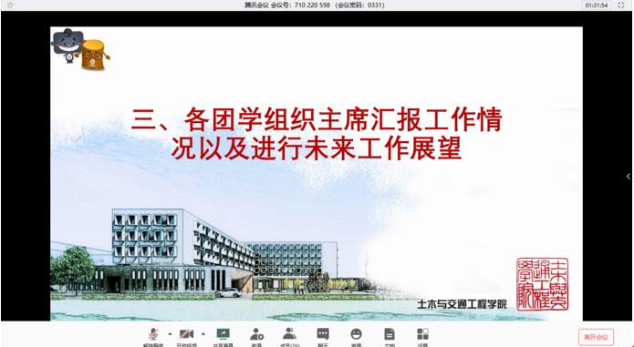 会议的第三部分,由各团学骨干分别汇报工作情况。团学骨干们针对上学年工作收获及完成情况做出总结,并结合本学期的学生需求和规划与老师进行交流。在刚结束的2019学年,土木学院学生组织秉承优良传统的同时,也在不断尝试、推陈出新,在假期里各组织积极行动为抗击疫情做出了表率,在老师和同学们的共同努力下取得了优异的成果。最后,秦岭老师鼓励大家在承担战“疫”期间统计和联络工作的同时,还要积极学习防疫知识,帮助同学做好思想疏导。此外,在疫情期间也要加强专业学习和联系互动,提高服务意识、责任意识,勇挑重担,做好学院与老师同学们之间的桥梁。