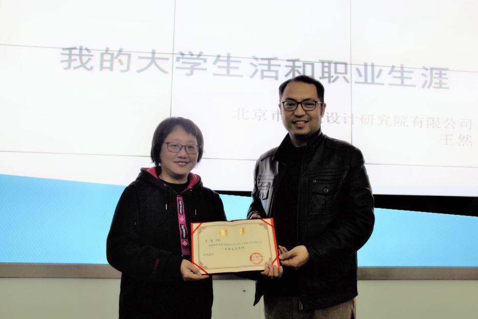 王然老师长期担任北京市大学生建筑结构设计竞赛的评委教师,同时对土木学院本科毕业设计给予很多指导,为进一步加强学院学风建设,促进优良学风营造,特聘王然老师作为土木学院“学业发展导师”。土木学院党委副书记车晶波为王然老师颁发聘书。王然老师未来将以校友和“导师”的双重身份,继续助力同学们的全面发展。