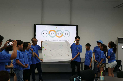 在车晶波老师宣布本次阜平实践团正式启动后,苑泉老师带领志愿者和孩子们进行接下来的破冰团建活动。为了让来自不同学校的孩子们都互相熟络起来,更便于开展之后的活动,首先每个人按顺序进行了一个简单的自我介绍,包括自己的姓名、学校以及爱好。接着大家进行了“我的小组”环节,将实践团成员和孩子们分成了三组,要求各个组在一张白纸上画出小组的队标,并共同思考队名和口号,十五分钟后小组上台进行展示。
