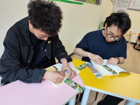 捐赠现场,志愿者对捐赠书籍核对信息、分类整理,确保后续管理更加便捷。心联会同学们代表学院“砼学心语”心理站捐赠部分心理健康科普类图书,并为河北阜平地区的孩子写下祝福寄语。