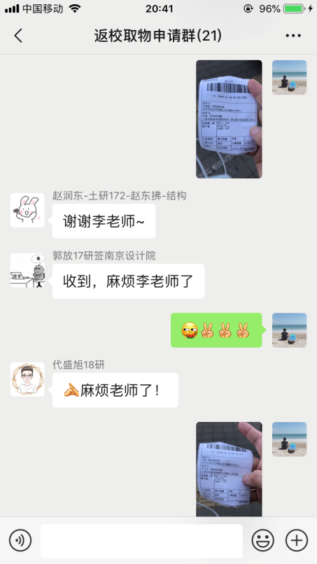 2019级辅导员苗胜杰老师说,参与到本次的活动发现能够积极调动班级骨干的力量,骨干们充分发扬雷锋精神,助人为乐,帮助京内外同学完成取物和邮寄,同心守望,在这关键时期共度难关。