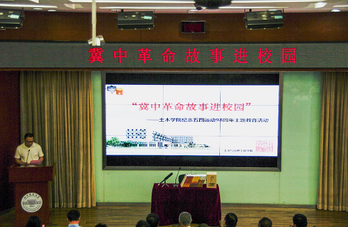 5月3日上午,习近平总书记到中国政法大学考察并发表重要讲话,在我校师生中引起强烈反响。5月9日,土木学院联合党委组织部、宣传部、学生工作部和校团委举办纪念五四运动98周年主题教育活动——“冀中革命故事进校园”,冀中抗战研究会受邀到我校为广大师生作报告。校党委组织部部长孙景仙,团委书记朱静,学生工作部部长黄尚荣、副部长蔡思翔,宣传部副部长孙强,土木学院党委书记冯宏岳、副书记车晶波、团委书记刘倩以及师生代表等200余人参加活动。