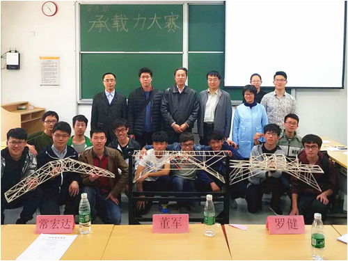 担任本次比赛的评委有:罗健、董军、李国华、常宏达、李晓照。五位老师为每一组同学设计的作品进行点评。作品的设计有的做工精美、巧夺天工,有的注重牢固、结构严谨。带着前期制作好的模型,每个参赛小组在比赛现场都有一分钟的作品介绍时间,在介绍完本组作品的设计理念、所用原理后,依次进行承重加载。