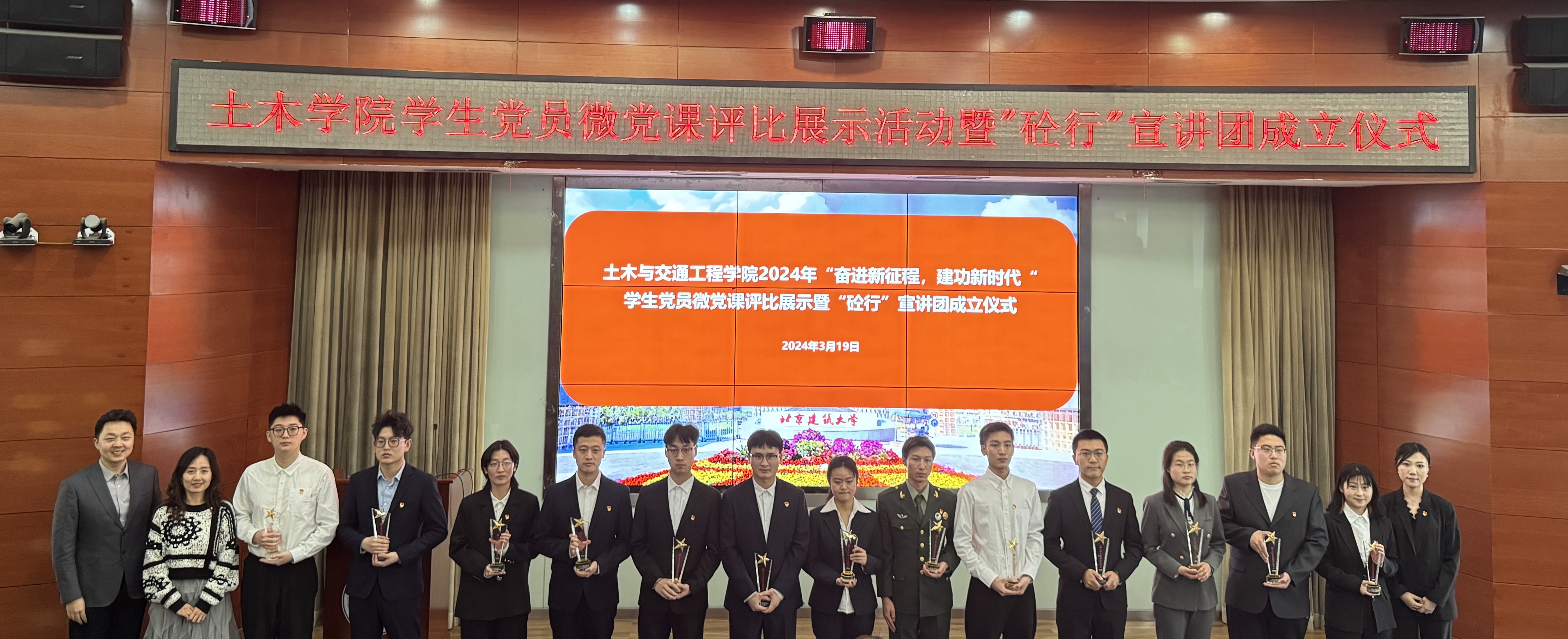为深入学习宣传贯彻习近平新时代中国特色社会主义思想和党的二十大精神,教育引导广大学生发扬红色传统、传承红色基因,在学习中感悟思想伟力,在宣讲中弘扬奋斗精神,在实践中奉献青年力量,3月19日,土木学院举办“奋进新征程 建功新时代”学生党员微党课展示评比活动暨“砼行”宣讲团成立仪式。土木学院党委书记车晶波、学生工作部副部长王秉楠、土木学院党委副书记陈思源、马院教师冯蕾、土木学院专业基础部教工党支部书记董军、组织员赵翠英参加了活动。13名学生党员逐一登台评比展示,学院党支部书记、学生党员、入党积极分子等100余人现场观摩。