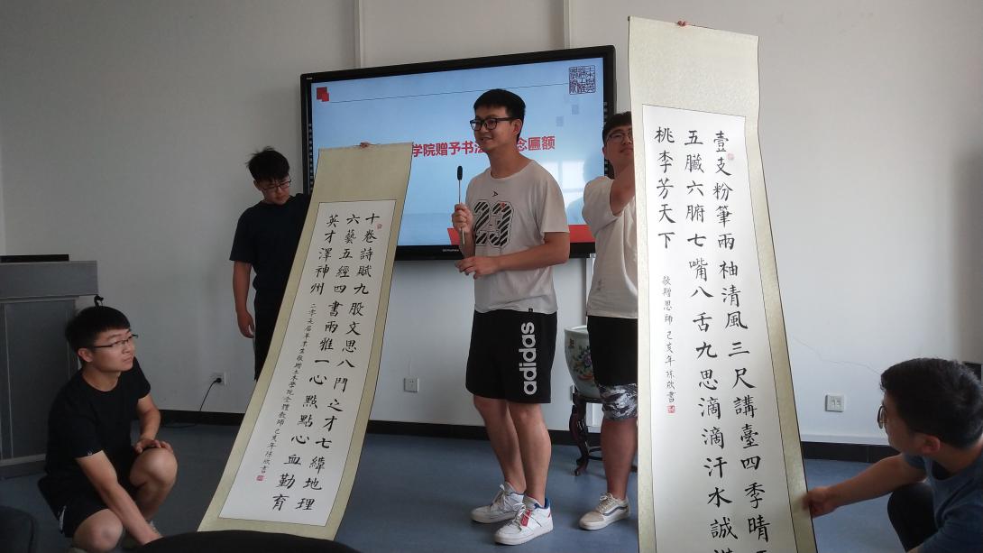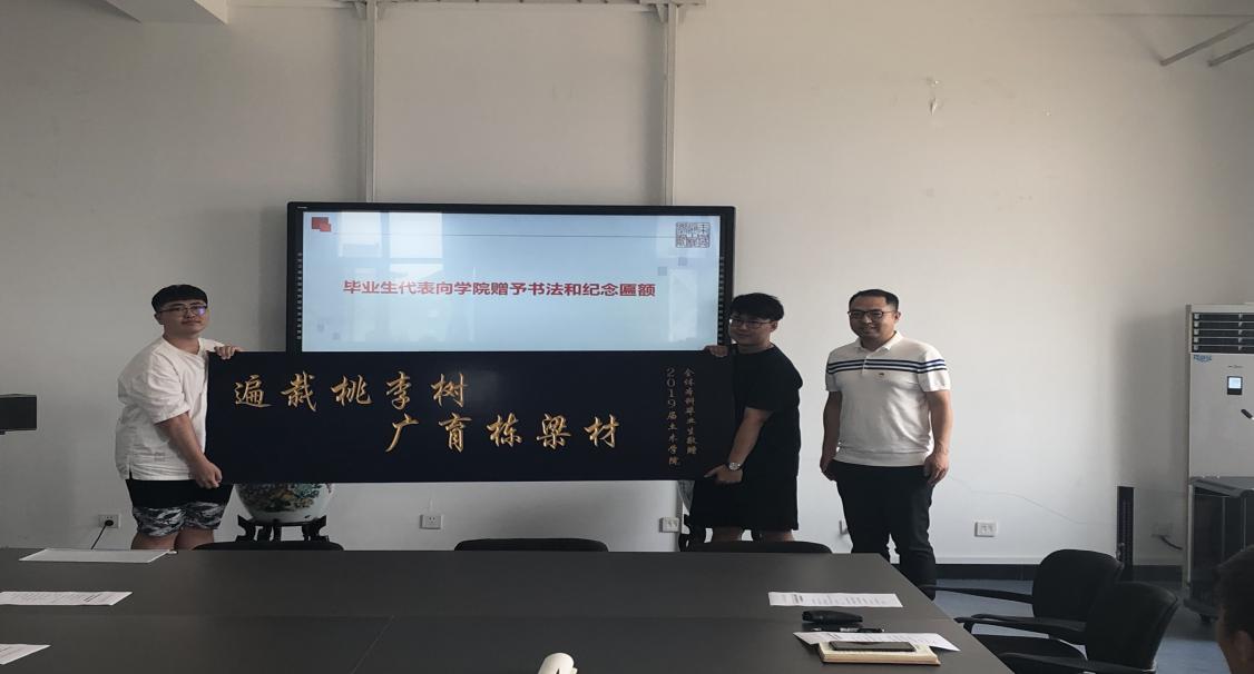 为答谢母校及学院四年的悉心培养,毕业生代表向学院赠送印有“遍栽桃李树 广育栋梁材”的感恩牌匾及优秀毕业生陈欣同学自己书写的书法作品,以表达对学院领导老师的感恩之情。