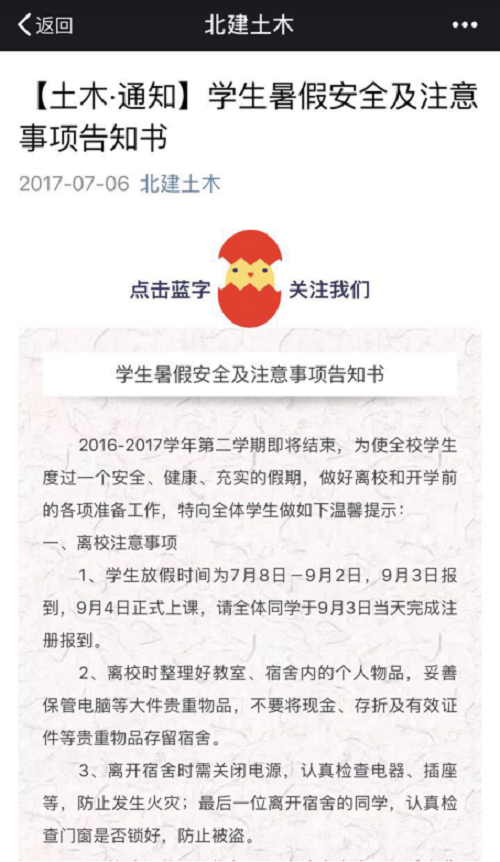 此外,各年级辅导员老师对学生进行暑期安全教育,重点强调暑期留校同学要注意人身、财产安全,遵守学校的各项规章制度,确保暑期在校的学习生活和谐安稳。