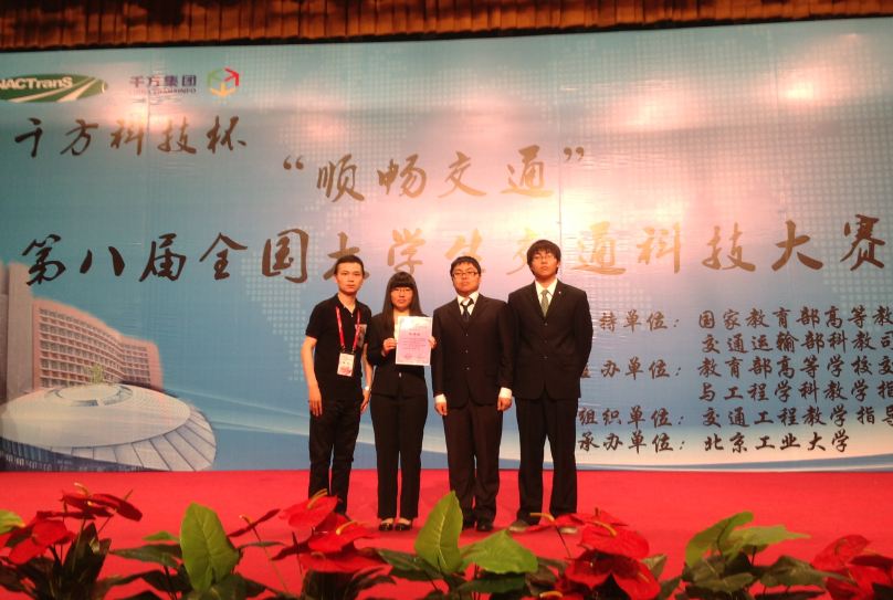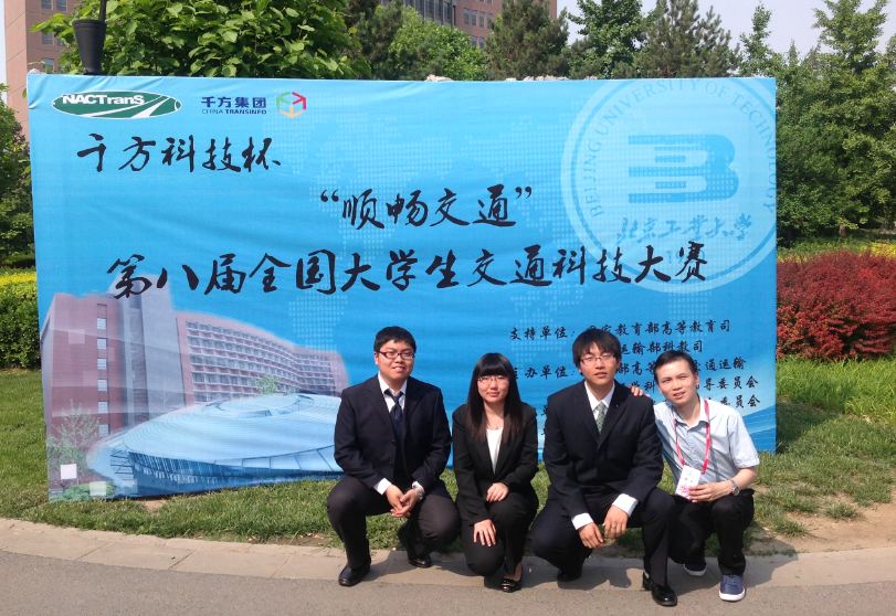 2013 年5月25日至26日,由教育部高等学校交通运输与工程学科教学指导委员会主办的“千方科技杯”第八届全国大学生交通科技大赛在北京工业大学举行,我校金年会官网选送的作品入围决赛并取得优秀奖的佳绩。校团委书记朱静老师,土木学院辅导员黄兴、刘倩、谷天硕老师带队参加了本次比赛。