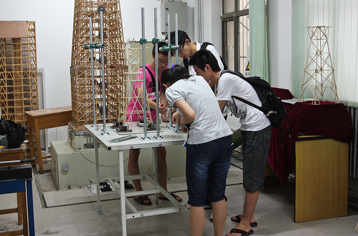 北京交通大学等参赛高校依照大赛的测试程序带着制作的参赛模型进行了静态水平加载试验和水平冲击加载试验;北京城市学院等参赛高校则仔细询问了模型的外观要求及正式比赛当天的流程问题。杜红凯老师和竞赛筹委会负责人王轩同学仔细回答了各高校的参赛队员的提问并对比赛的当天具体流程进行了详细讲解。