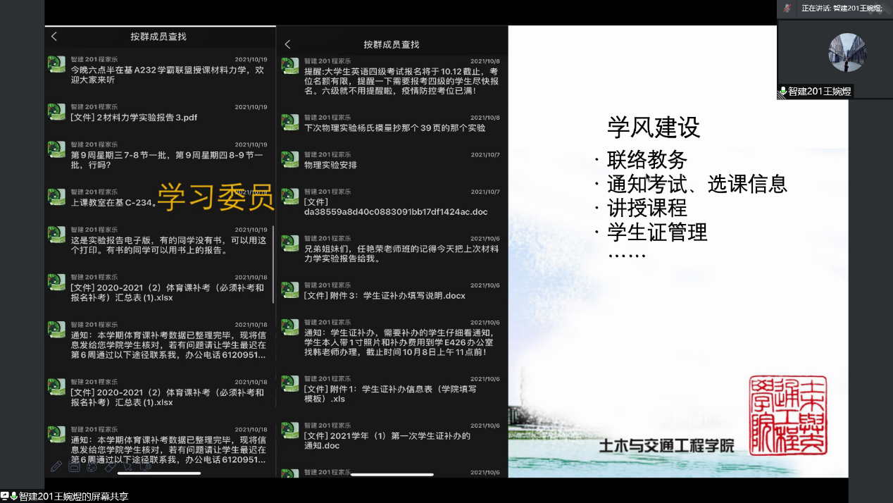 紧接着,20级优良学风班土202班、交201班和智建201班各自分享了自身班级建设和班团一体化的推进情况。他们表示:班团一体化起到了帮助班长支书减负的作用,使得班长支书们能够将工作重心重新转移到班级的建设和规划上来。同时,工作的分散也很好地锻炼到了其余6位班委,使得人人有事干,事事有人干,班委的整体实力得到了提升,对班级的建设和管理更上一层楼。