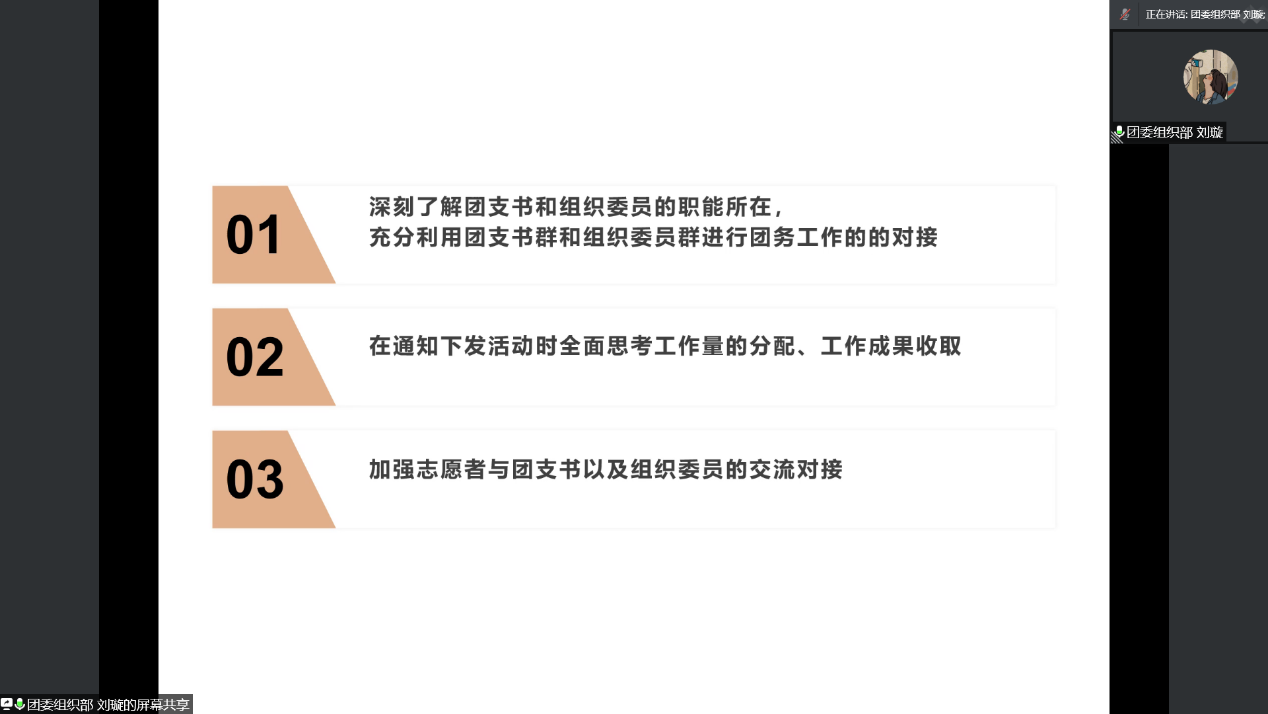 会议伊始,团委办公室向大家介绍了班团一体化的基本概念和实施意义。随后,团委组织部、宣传部,学生会学习部、生活部、文体部,心联组织部分别就班级对接制度、近期工作总结、未来工作展望三个方面汇报班团一体化工作推进的具体情况。