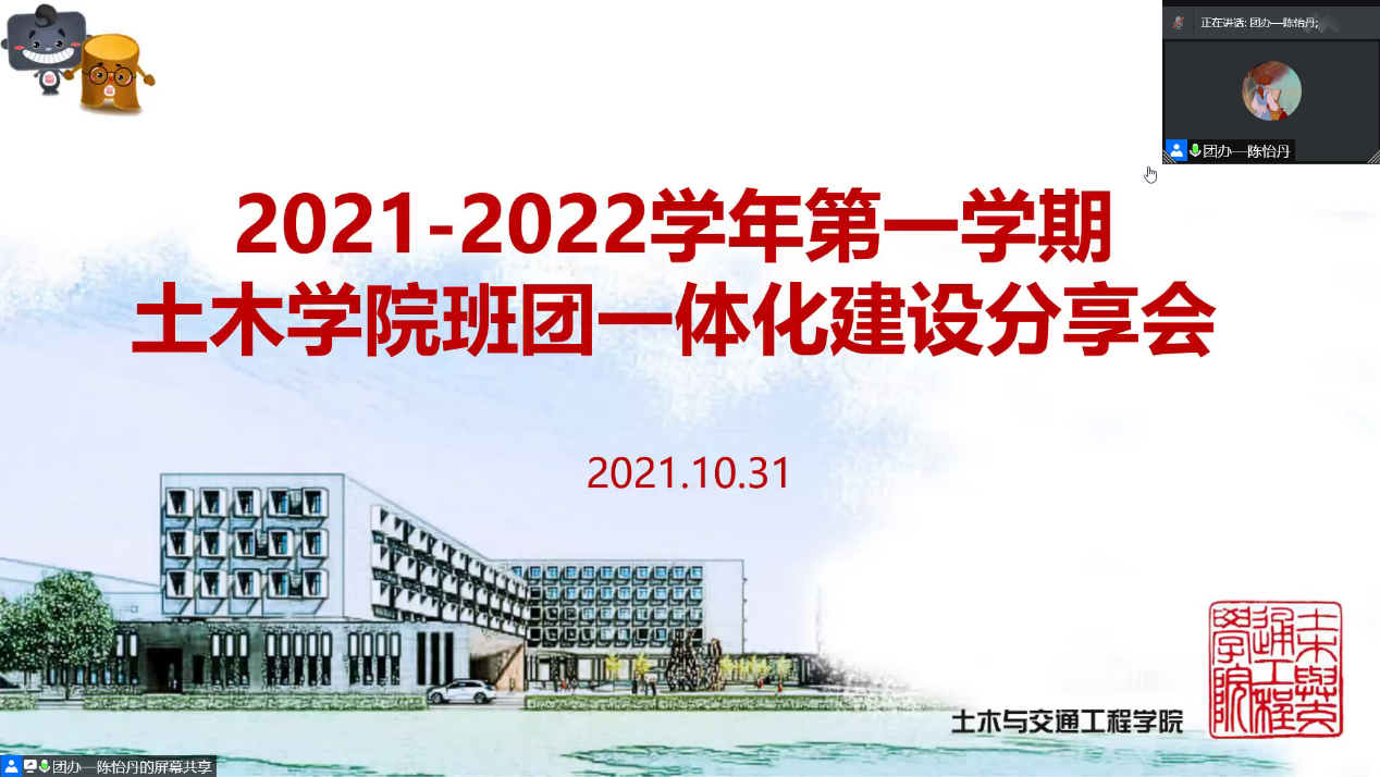 为深入贯彻党中央的群团工作会议精神,落实高校共青团改革,深入提升基层工作活力,土木学院于10月31日举行了2021-2022学年班团一体化建设线上分享会议。出席会议的有土木学院团委书记苑泉、2020级辅导员刘梦瑶老师,以及土木学院各团学组织骨干、20级优良学风班代表和20、21级各班长支书。