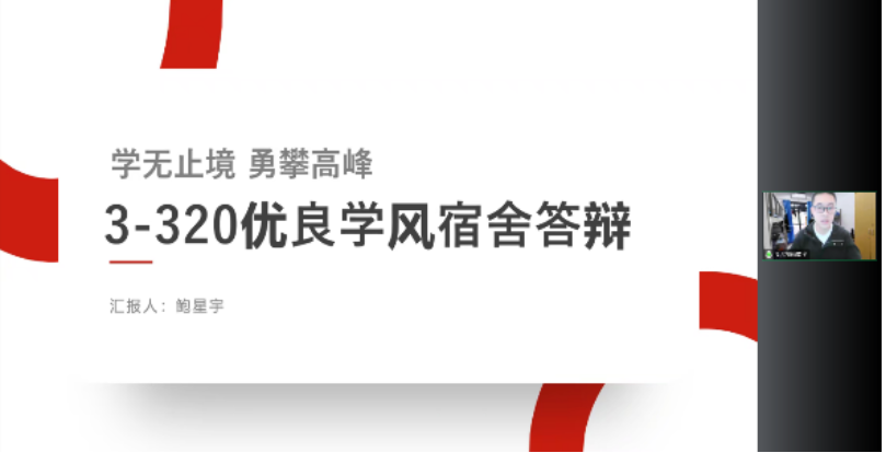 按照学校《关于开展2021-2022学年“优良学风十佳宿舍”、“优良学风示范宿舍”创建与评比活动的通知》文件要求,经自愿报名及前期遴选,共有6间宿舍入围答辩环节,通过宿舍展示及问辩交流展现宿舍风采。在展示环节,参赛宿舍展示了宿舍环境卫生与个性化布置等方面,同时从宿舍的学风举措与特色活动方面进行了介绍。经过提问作答与打分,最终,10-329宿舍获一等奖,2—216宿舍、3—320宿舍获二等奖,1—310宿舍、2—217宿舍、5—242宿舍获三等奖。