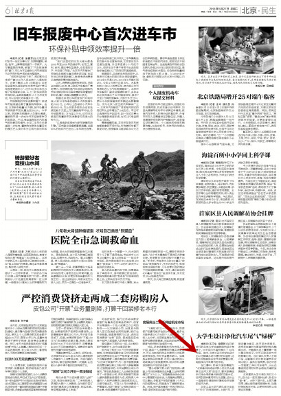 本报讯(实习生 徐颢哲)在日前举行的北京大学生建筑结构设计竞赛上,18所京内外高校展示了34件作品。其中,北京工业大学学生设计出以光触媒水泥为建材的双层桥,这种水泥能够除去空气中的氮氧化物,起到净化汽车尾气的作用。